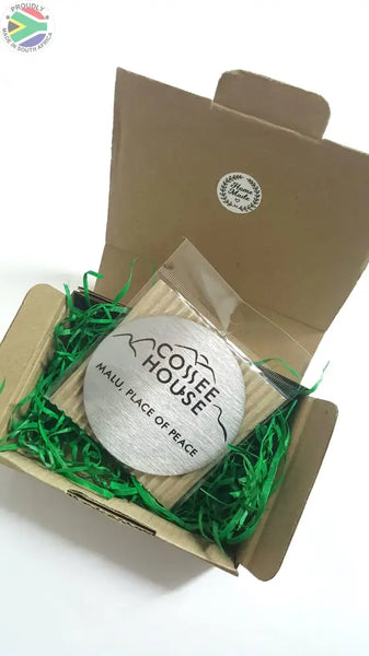 Each coaster is stainless steel and laser engraved in black and comes with plastic bump-ons stuck to the bottom.