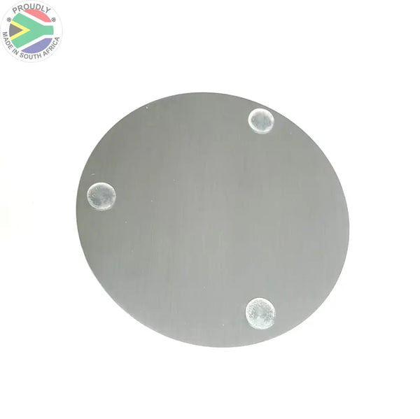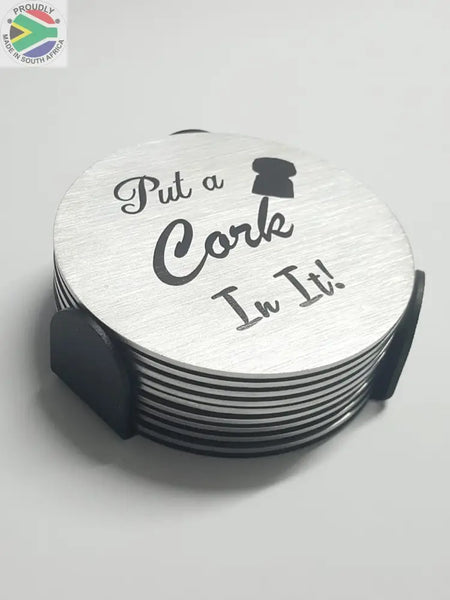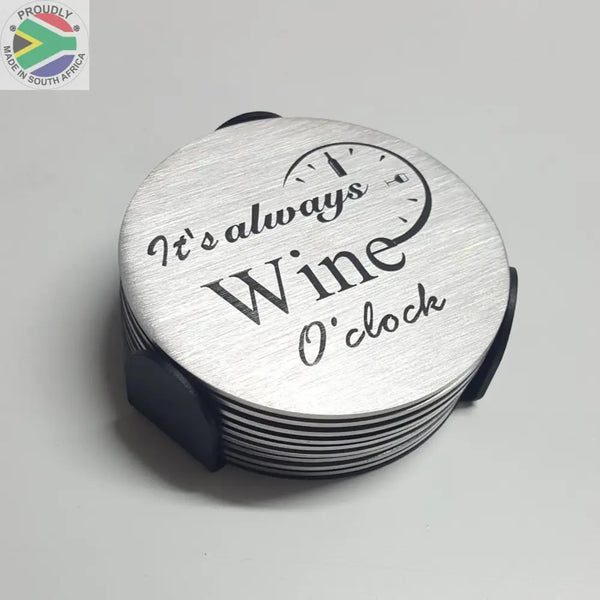 Each coaster is stainless steel and laser engraved in black and comes with plastic bump-ons stuck to the bottom..